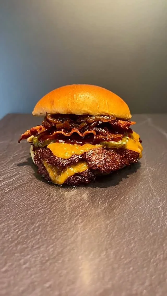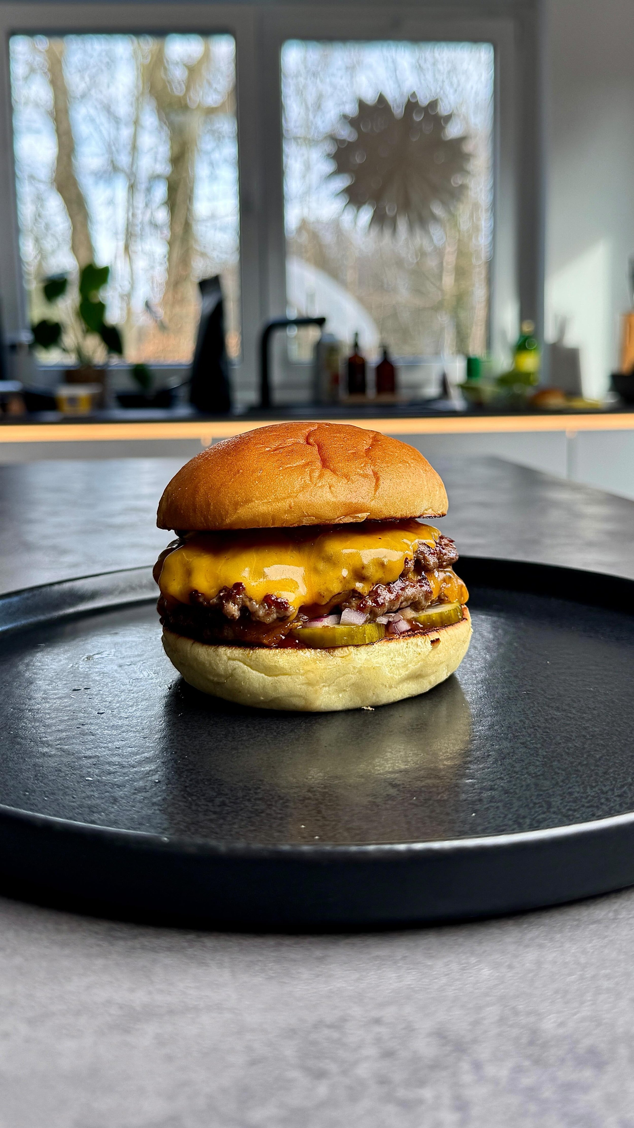 Unsere Smashburger sind mehr als nur Burger – sie sind pure Leidenschaft vom Grill. Aus 100 % Dry Aged Rindfleisch frisch von Hand geformt, direkt auf der heißen Grillplatte „gesmasht“ und perfekt karamellisiert. Das Ergebnis: außen kross, innen saftig – mit intensivem, nussigem Fleischgeschmack, der durch den Dry-Aging-Prozess entsteht.